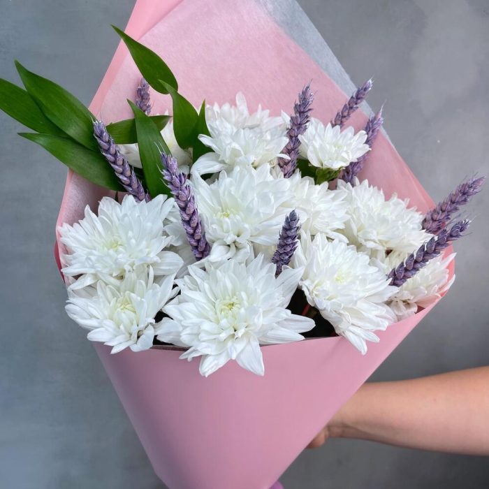 «Лавандовое созвездие» Букет из розы, гвоздики, статица и хлопка