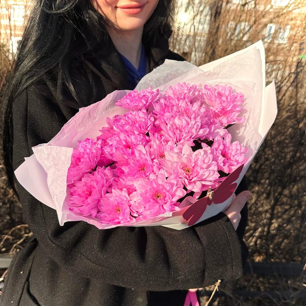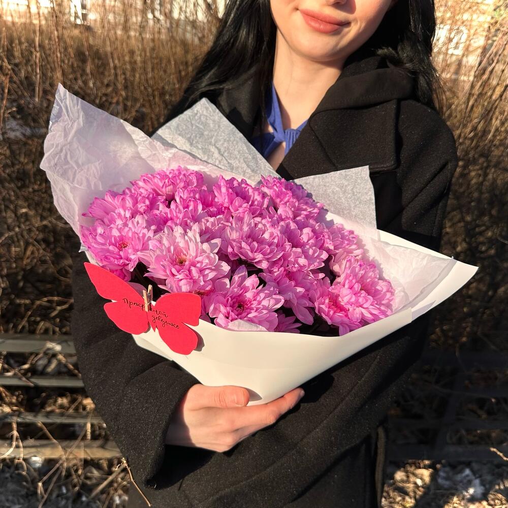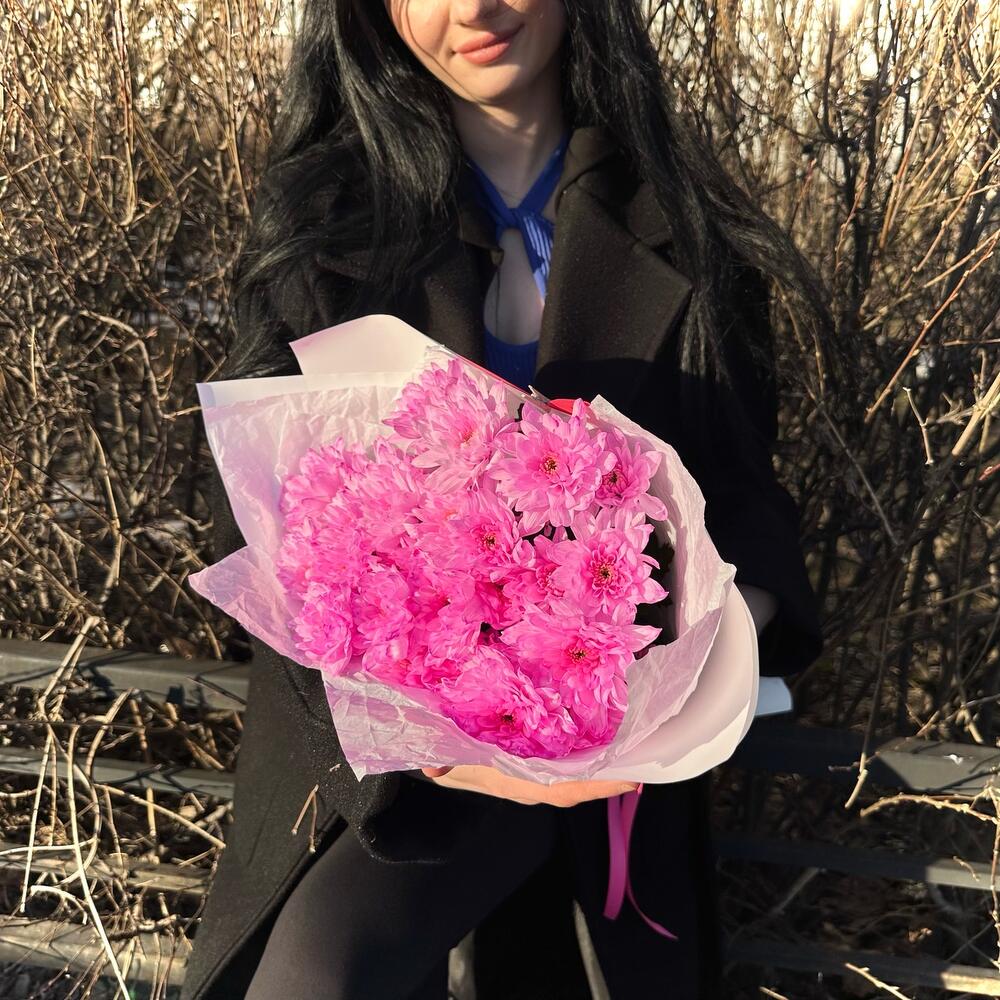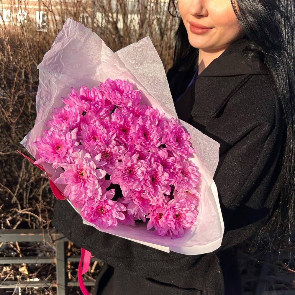 Лента атласная – 1 шт.Открыточка с вашими пожеланиями – 1 шт.Хризантема кустовая крашенная розовая – 5 шт.Тишью белое – 2 шт.пленка матовая белая – 2 шт.