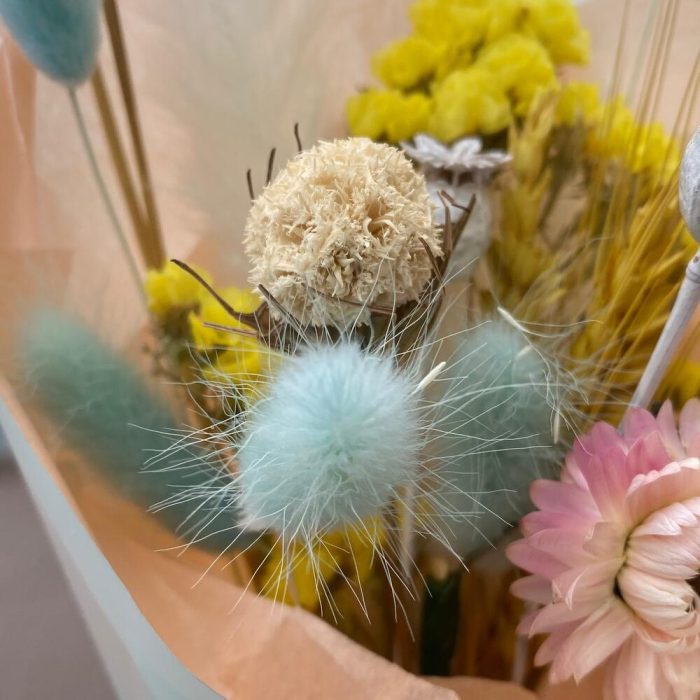 Скабиоза – 1 шт.Статица – 3 шт.Лагурус – 5 шт.Гелихризум – 1 шт.Пшеница (сухоцвет) – 2 шт.мак коробка – 2 шт.