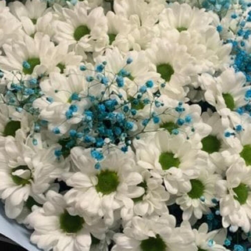 Хризантема кустовая – 25 шт.Гипсофила – 4 шт.Упаковка дизайнерская – 4 шт.