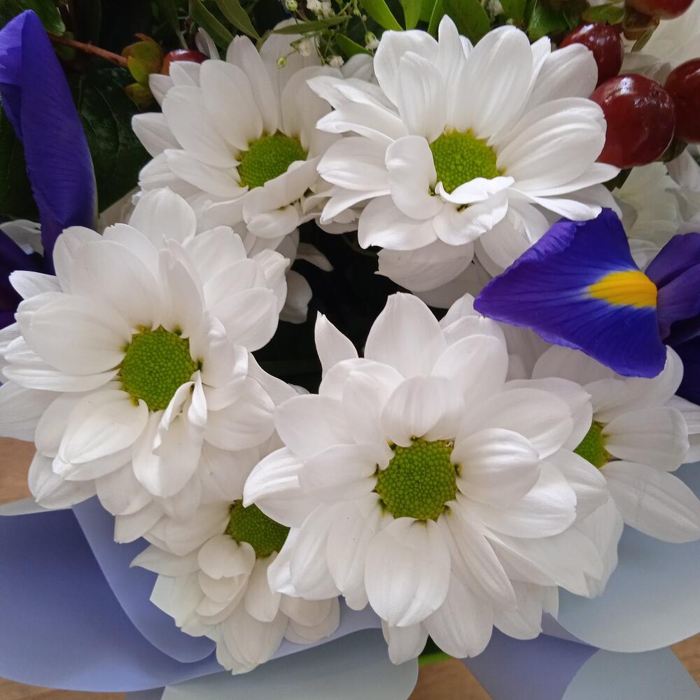 Ирис Blue Magic – 6 шт.Хризантема кустовая – 5 шт.Гиперикум красный КУСТОВОЙ – 3 шт.Гипсофила – 1 шт.Фисташка пучок – 1 шт.Упаковка дизайнерская – 1 шт.Лента – 1 шт.