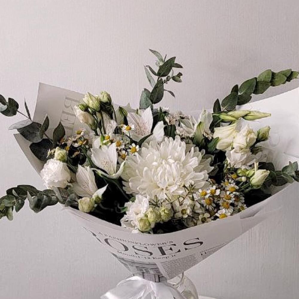 Альстромерия – 2 шт.Эвкалипт – 4 шт.Лента атласная – 3 шт.Ромашка кустовая – 3 шт.Хризантема одноголовая – 1 шт.Упаковка дизайнерская – 3 шт.эустома белая – 2 шт.