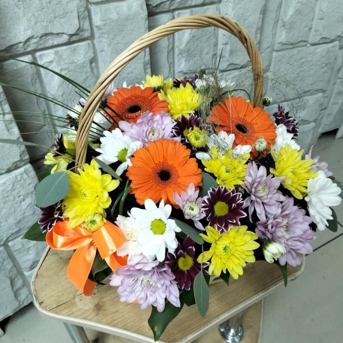 Эвкалипт – 2 шт.Лента атласная – 1 шт.Гербера мини – 3 шт.Оазис флористический – 1 шт.Хризантема кустовая микс – 5 шт.корзина плетенная средняя – 1 шт.Паникум Фонтан – 1 шт.