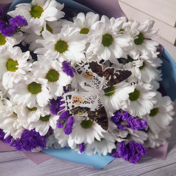 Хризантема кустовая – 7 шт.Лента атласная – 1 шт.Статица синяя – 4 шт.Пленка матовая – 2 шт.Открыточка с вашими пожеланиями – 1 шт.Бабочка декоративная – 1 шт.