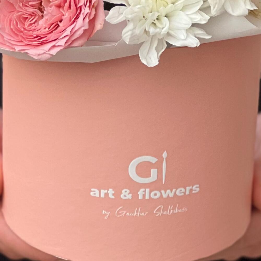 Хризантемы и Пионовидные кустовые розы в коробке + открытка ручной работы в подарок