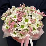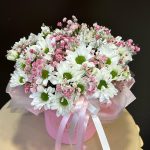 Композиция в коробке из кустовой хризантемой и розовой гипсофилой