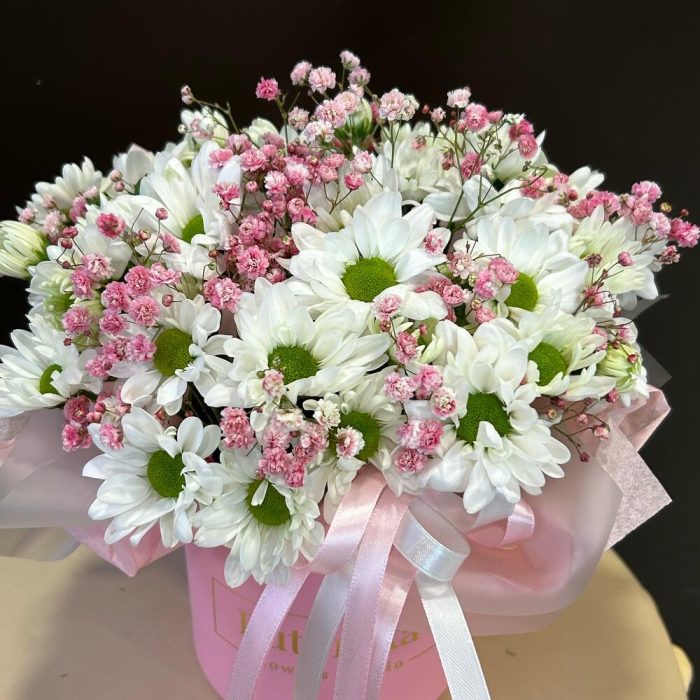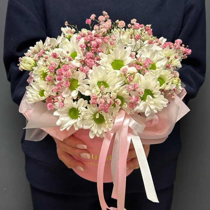 Композиция в коробке из кустовой хризантемой и розовой гипсофилой