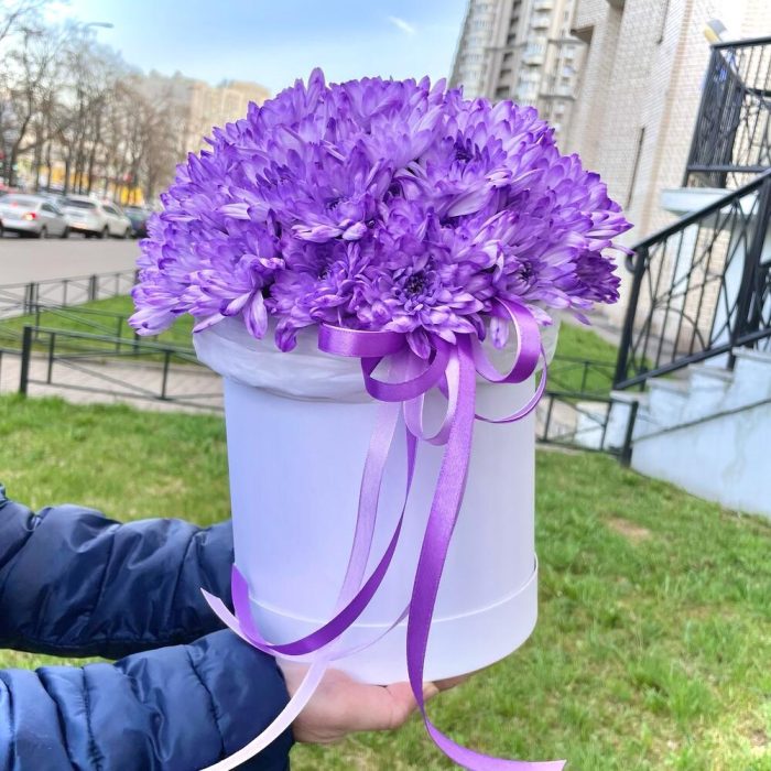 Хризантема кустовая – 7 шт.Лента атласная – 1 шт.Тишью – 2 шт.Шляпная коробка – 1 шт.Открыточка с вашими пожеланиями – 1 шт.