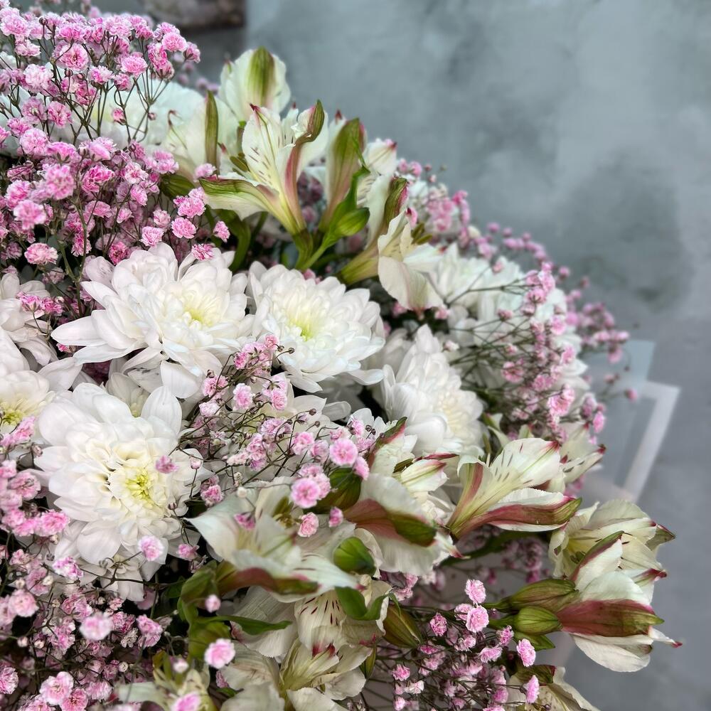 Нежный букет из кустовой Хризантемы, альстромерии и гипслфилы