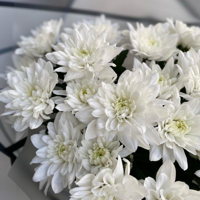 Хризантема кустовая – 5 шт.Лента атласная – 2 шт.Упаковка дизайнерская – 5 шт.