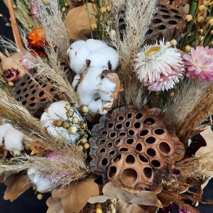 Лотос – 3 шт.Лента атласная – 3 шт.Корзина плетеная – 1 шт.Оазис флористический – 1 шт.Гелихризум – 18 шт.Дуб – 3 шт.Хлопок ветка – 1 шт.кортадерия – 6 шт.олеандр – 1 шт.лен пучок – 1 шт.
