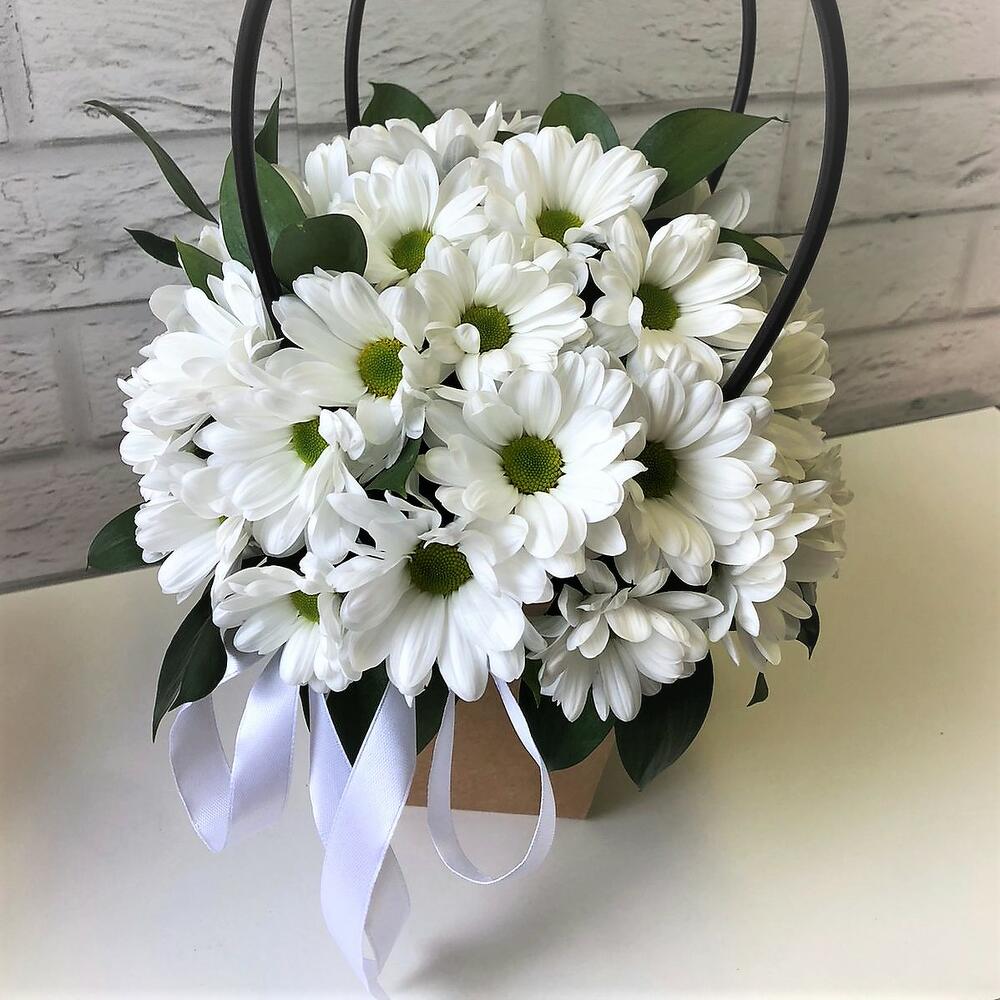 Хризантема кустовая – 7 шт.зелень букетная – 4 шт.сумка крафт с ламинацией – 1 шт.Пена флористическая – 1 шт.Лента атласная – 1 шт.