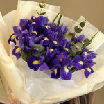 Ирис – 15 шт.Эвкалипт – 2 шт.Лента атласная – 1 шт.Упаковка дизайнерская – 2 шт.
