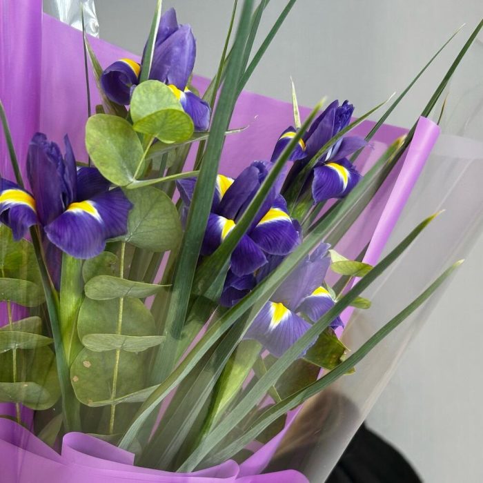 Ирис – 5 шт.Эвкалипт – 1 шт.Лента атласная – 1 шт.Упаковка дизайнерская – 2 шт.