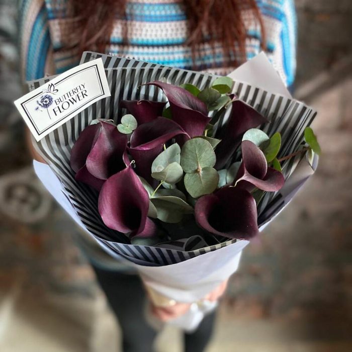 Букет из 9 черных калл с эвкалиптом в упаковке “Агостина”