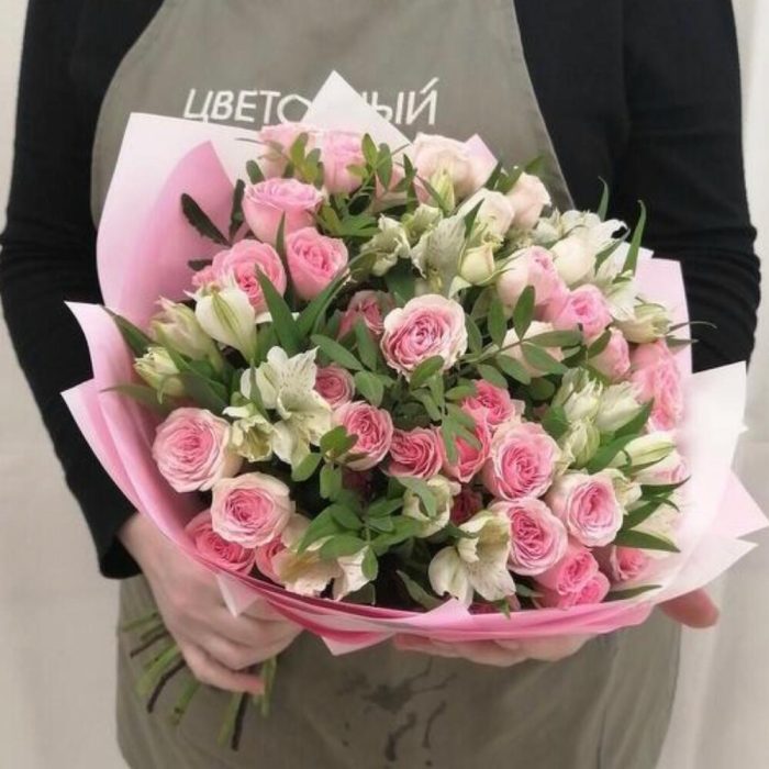 Букет из кустовой пионовидной розы «Ягодный смузи»(Роза кустовая пионовидная Кения , альстромерия )