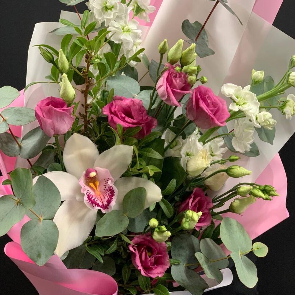 Орхидея Цимбидиум – 1 шт.Маттиола – 2 шт.Лизиантус – 2 шт.Фисташка – 3 шт.Эвкалипт – 2 шт.Упаковка дизайнерская – 1 шт.