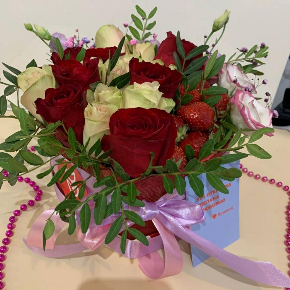 Клубника – 250 гр.Лизиантус – 1 шт.Упаковка дизайнерская – 1 шт.Фисташка пучок – 1 шт.Сердце коробка – 1 шт.Губка флористическая – 1 шт.розы красные – 9 шт.ленты атласные – 3 шт.розы белые – 10 шт.