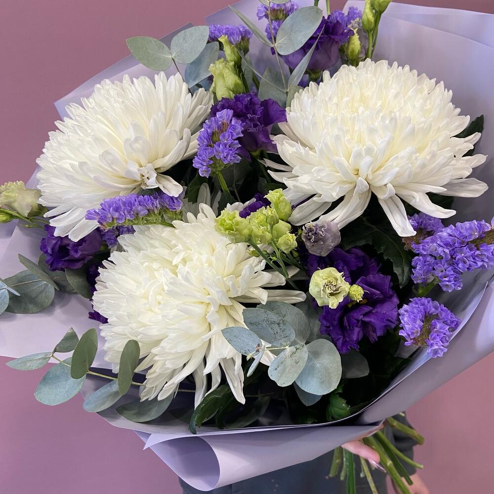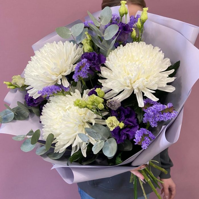 антонов – 3 шт.Статица – 1 шт.Эустома – 2 шт.Эвкалипт – 3 шт.Корейская упаковка – 1 шт.бант атласный – 1 шт.