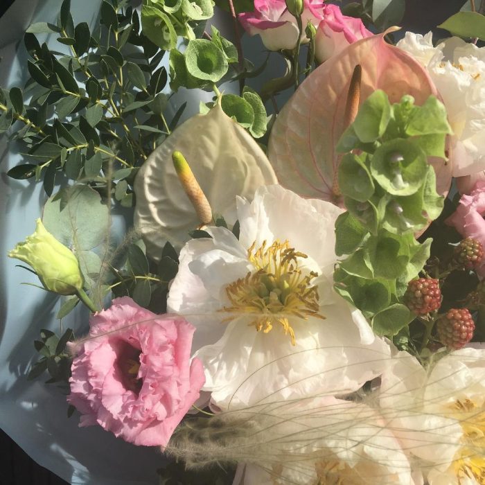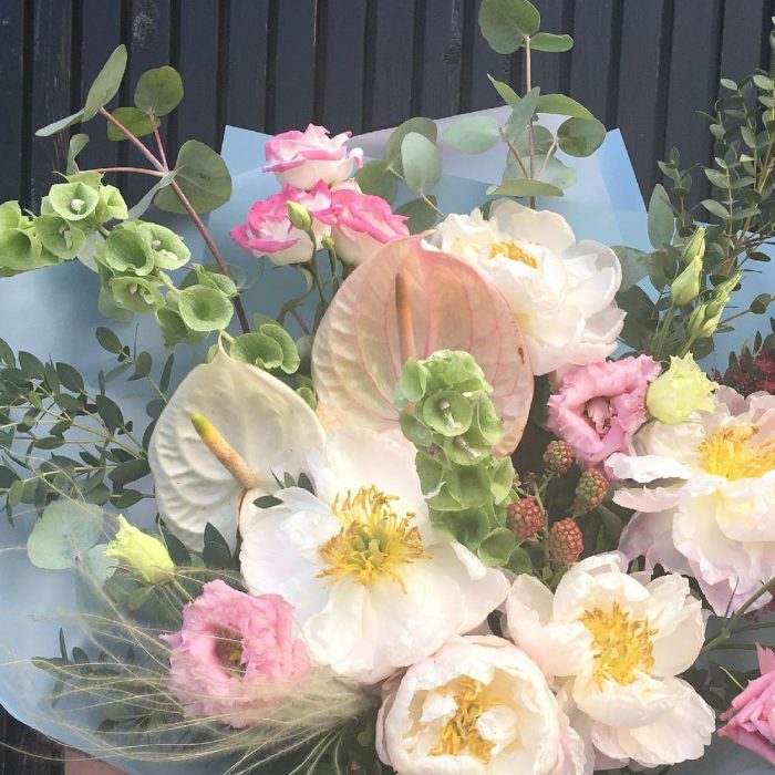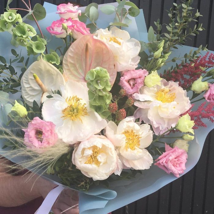 Антуриум – 2 шт.Пион – 5 шт.Лизиантус – 5 шт.Астильба – 2 шт.Молюцелла – 2 шт.Ковыль – 1 шт.Ежевика – 1 шт.Эвкалипт – 7 шт.Упаковка – 2 шт.Лента атласная – 2 шт.