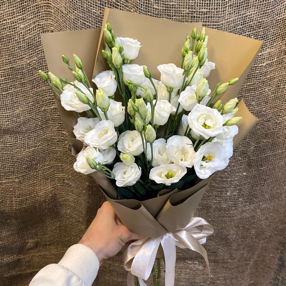 Лента атласная – 2 шт.Лизиантус (эустома) – 5 шт.Упаковка корейская пленка – 1 шт.