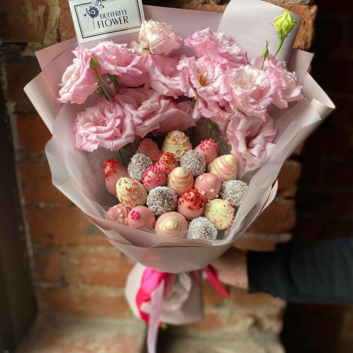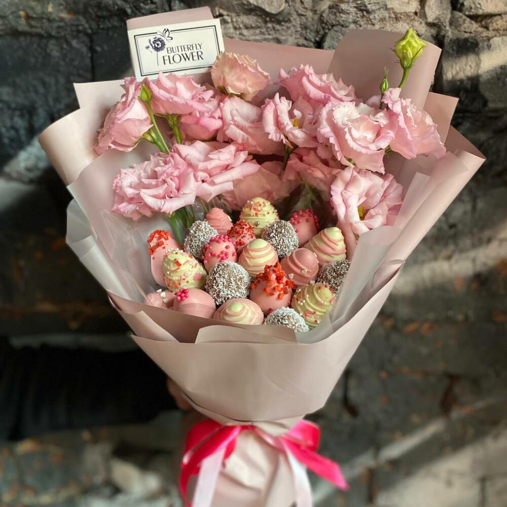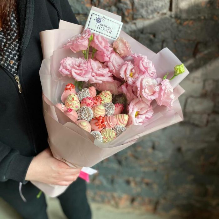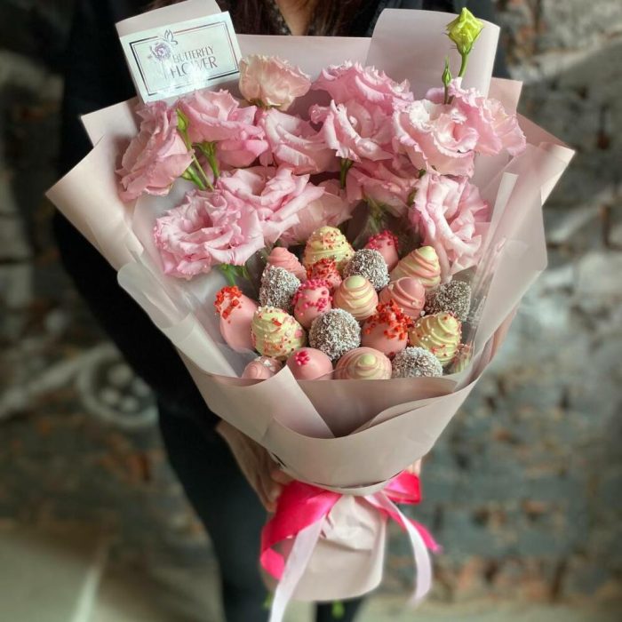 Съедобный фруктовый букет из клубники в шоколаде и роз в стильной упаковке "Розовый сад"