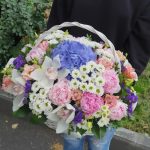 Корзина с пионовидными лилиями, полевыми маттиолами и розами