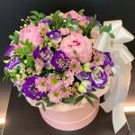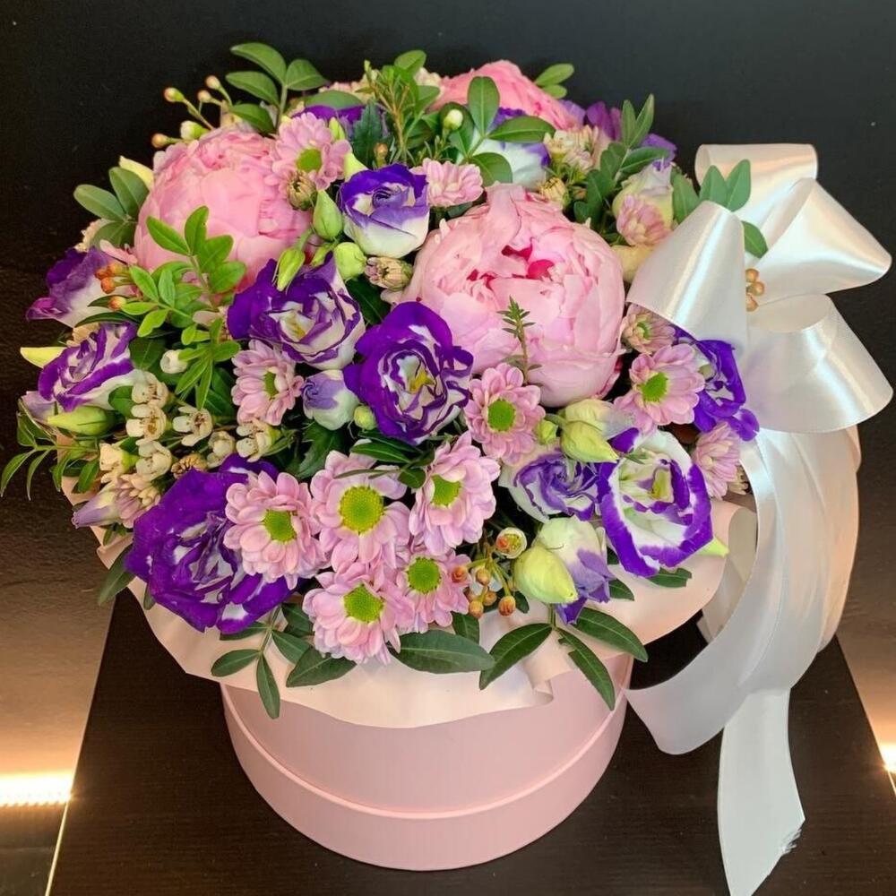 Цветы в коробке кустовые пионовидных розы с эвкалиптом