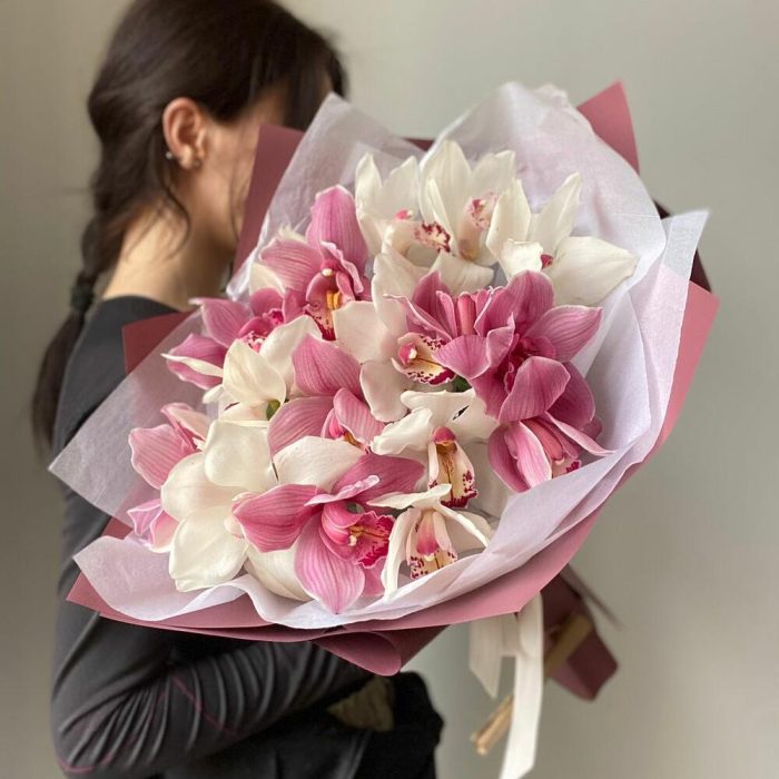 Букет из гортензий, диантусов, самшита, цимбидиума, роз, эустомы и лимониума в стильной упаковке