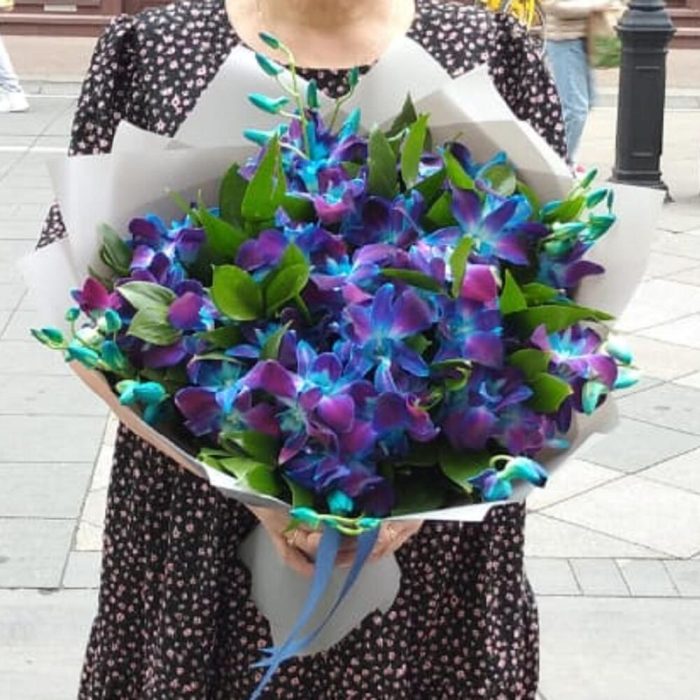 Орхидея дендробиум синяя – 45 шт.Дизайнерская упаковка – 2 шт.Рускус – 10 шт.Лента атласная – 1 шт.любовь флориста (бесплатно) – 1 шт.подкормка для цветов chryzal – 1 шт.инструкция по уходу за цветами – 1 шт.удлинитель для орхидеи – 22 шт.