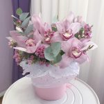 Нежная композиция из розовых орхидей и эвкалипта