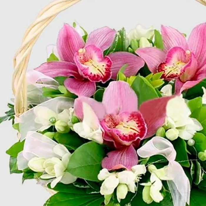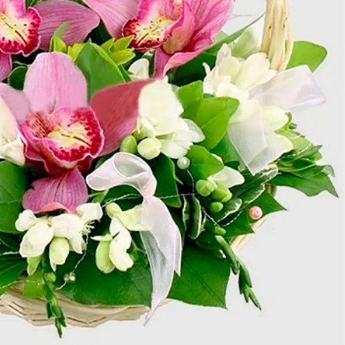 Нежная, трогательная композиция из орхидей цимбидиум и белоснежных фрезий в корзинке. Ансамбль дополнен зеленью и декоративными элементами из лент и бусин. Для самых очаровательных принцесс! Аромат фрезий настолько притягателен, что получательниц не захочет выпускать такую корзинку из рук 🙂 Подарите кучу позитивных эмоций дорогому человеку!