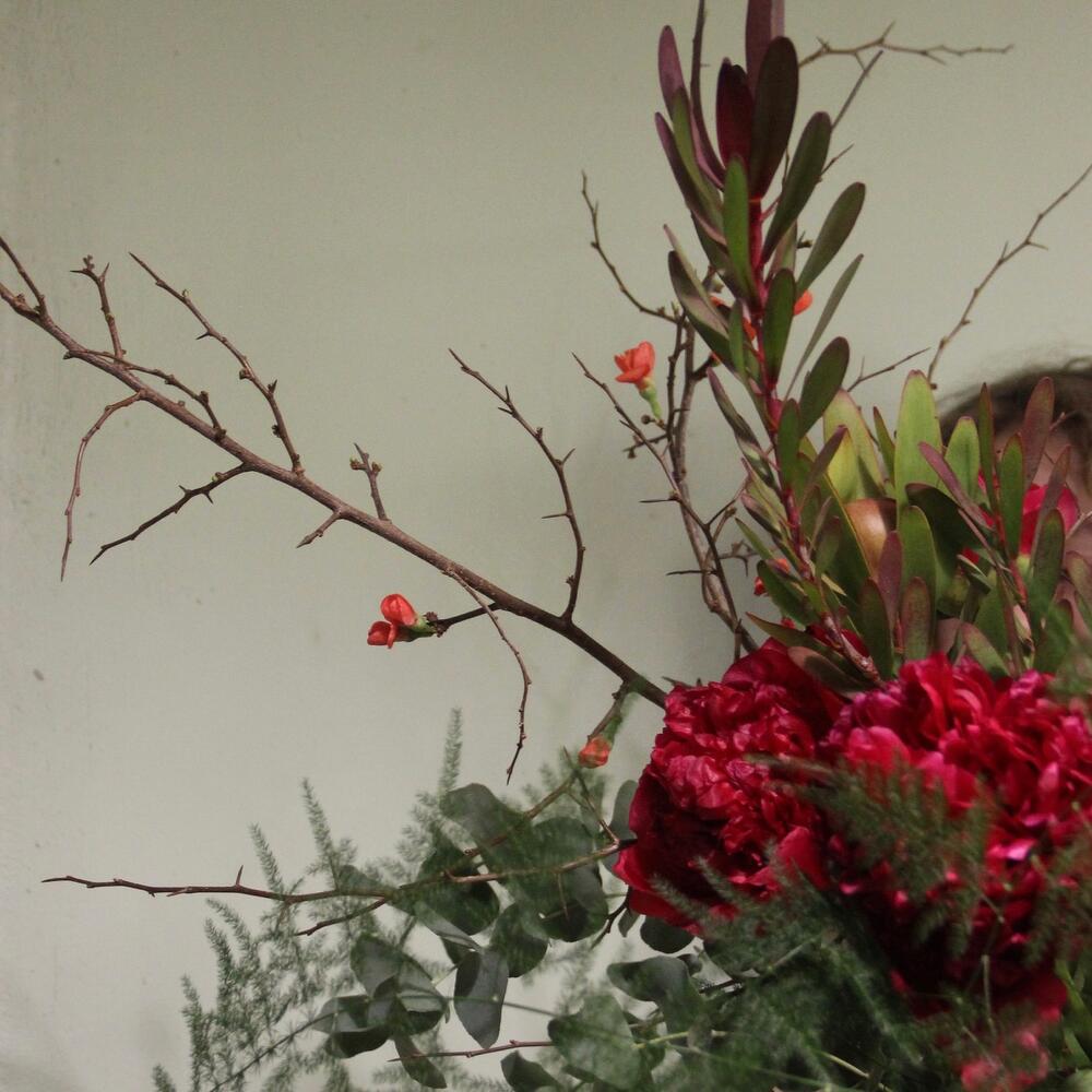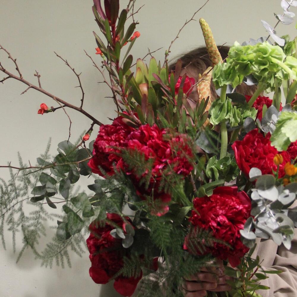 Алый – букет с пионами и ветвями