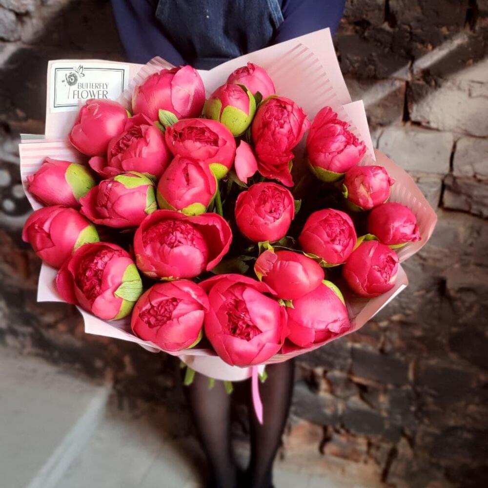 Букет из 23 ярко-розовых пионов в дизайнерской упаковке "Сьюзи Кью"