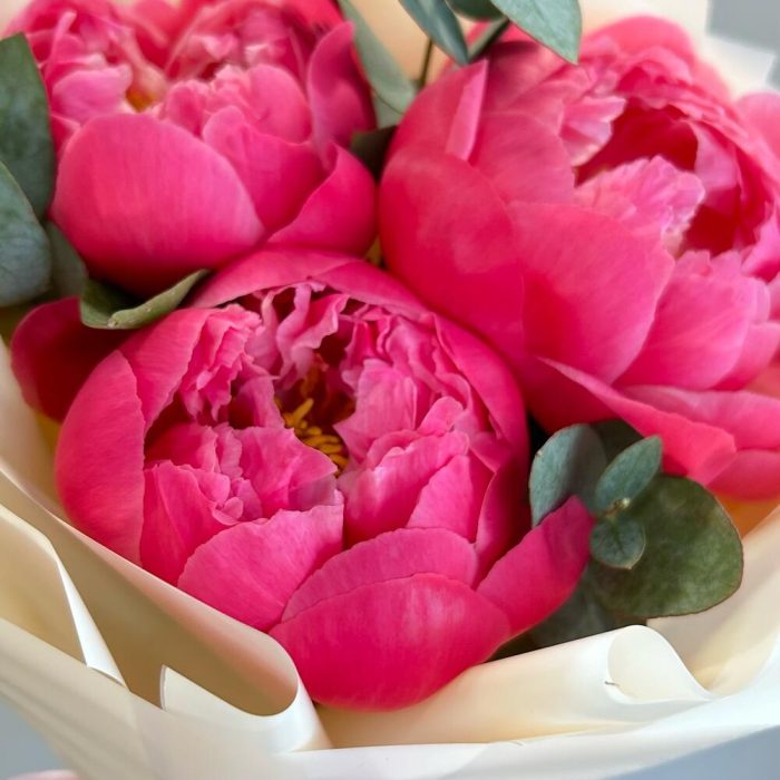 Пион – 3 шт.Эвкалипт – 1 шт.Лента атласная – 1 шт.Упаковка дизайнерская – 2 шт.