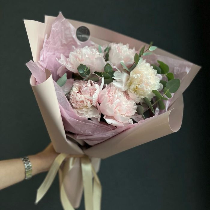 Атласная лента – 1 шт.декоративная упаковка – 1 шт.пионы – 5 шт.Эвкалипт – 3 шт.