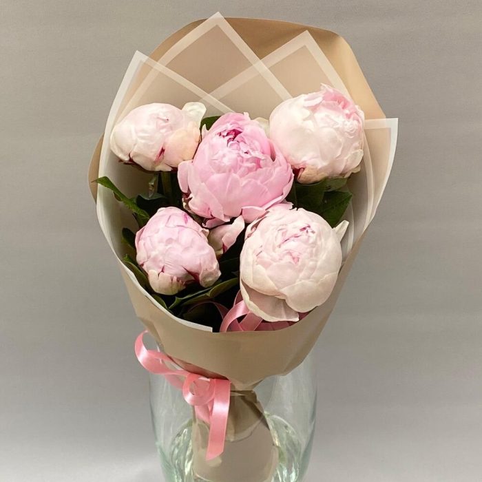 Лента атласная – 1 шт.Упаковка дизайнерская – 1 шт.пионы розовые премиум сара бернар – 5 шт.