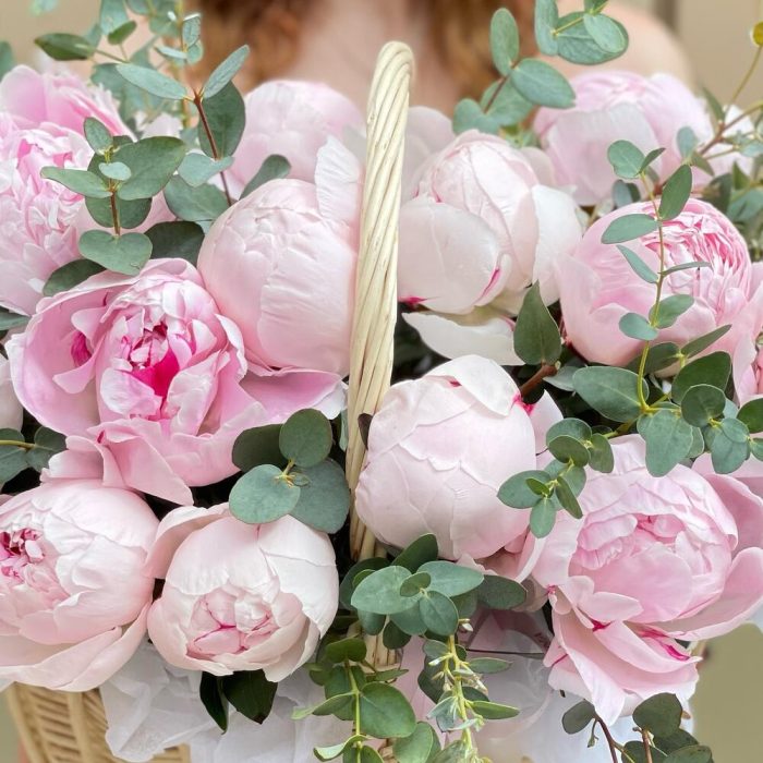 Корзина с пионами и эвкалиптом