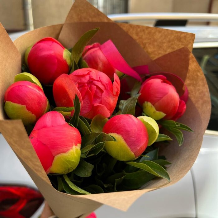 Пион Коралл Шарм (Coral Charm) – 7 шт.Лента атласная – 1 шт.Упаковка крафт – 1 шт.