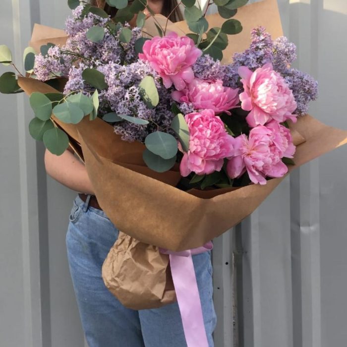Лента – 2 шт.Пион – 5 шт.Сирень – 9 шт.Эвкалипт – 3 шт.Упаковка крафт – 2 шт.
