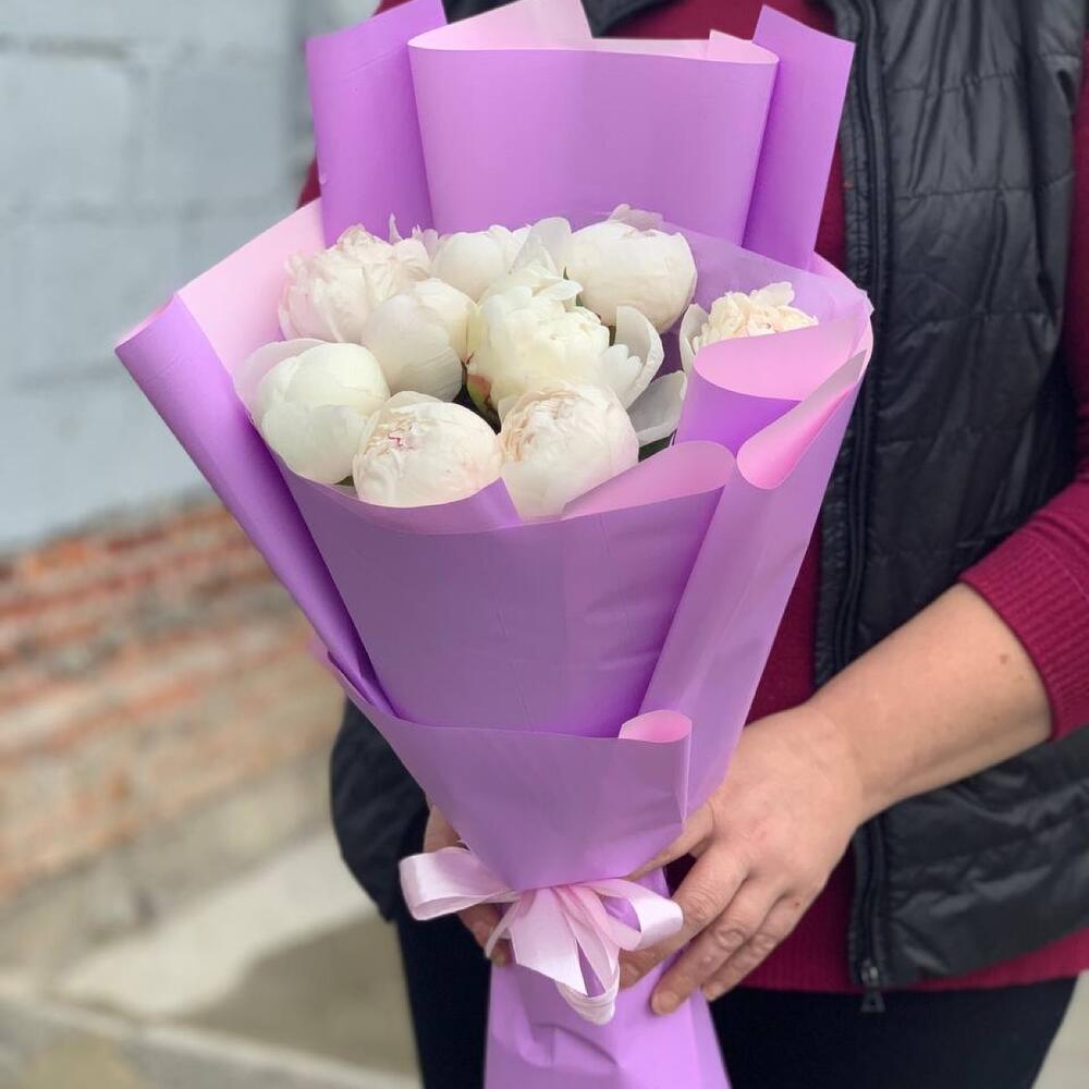 Пион белый – 9 шт.Упаковка дизайнерская – 1 шт.Лента атласная – 1 шт.