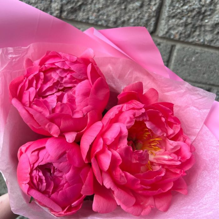 Лента атласная – 1 шт.Фисташка – 1 шт.Упаковка дизайнерская – 3 шт.Пион коралл шарм – 3 шт.