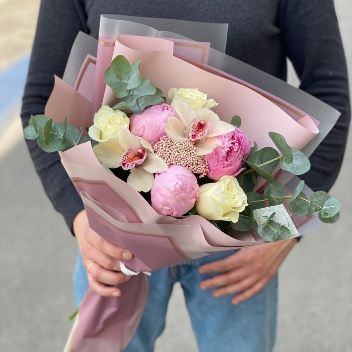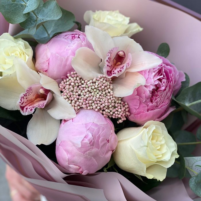 Гламурная коробочка из эустомы, пионовидных роз и пиона