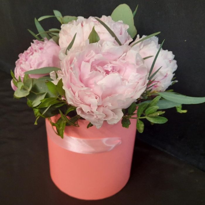 Эвкалипт – 1 шт.Коробка шляпная – 1 шт.Фисташка – 1 шт.Пион Сара Бернар – 5 шт.Оазис флористический – 1 шт.