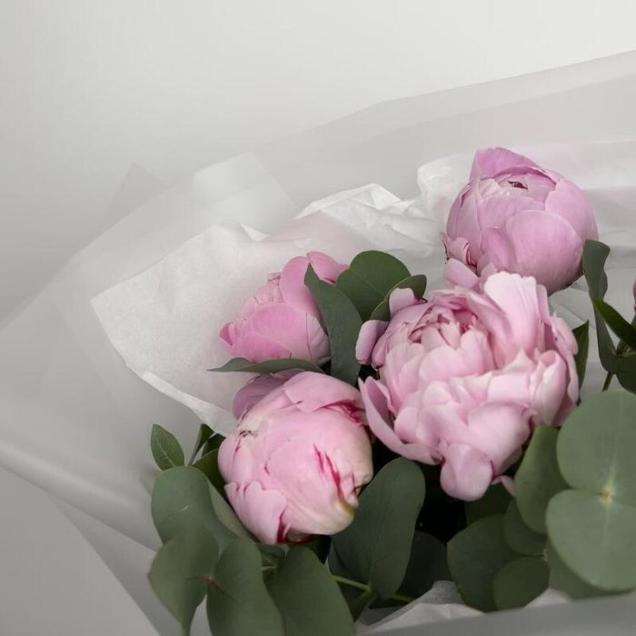 Нежно-розовые пионы 5 шт с эвкалиптом в дизайнерской упаковке – отличный комплимент любой девушкеК букету в качестве подарка подкрепим кризал, инструкцию по уходу за цветами и шоколадку!