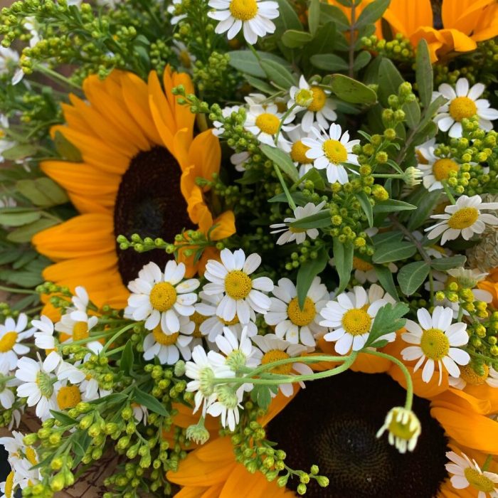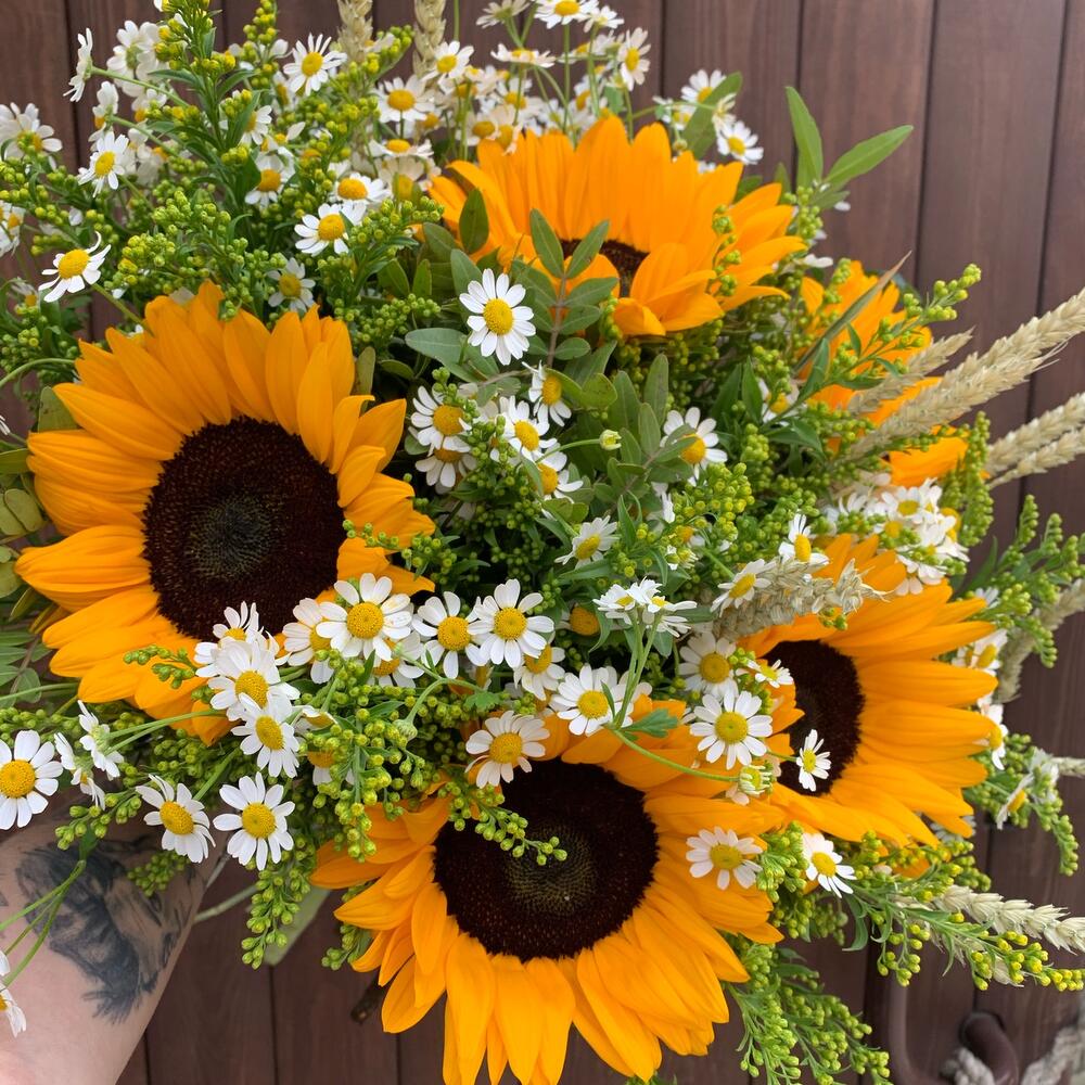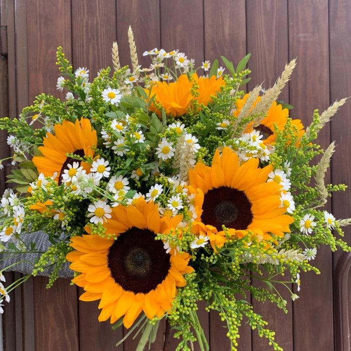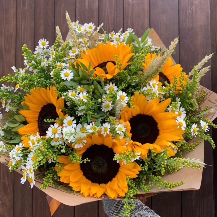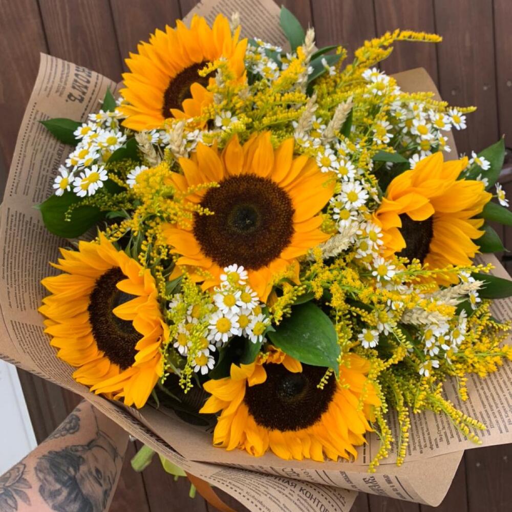 Подсолнух – 5 шт.Матрикария – 7 шт.Солидаго – 5 шт.триникум – 7 шт.Зелень – 3 шт.