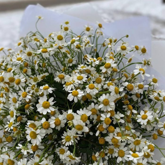 Лента атласная – 2 шт.Упаковка дизайнерская – 3 шт.матрикария ромашка кустовая – 15 шт.