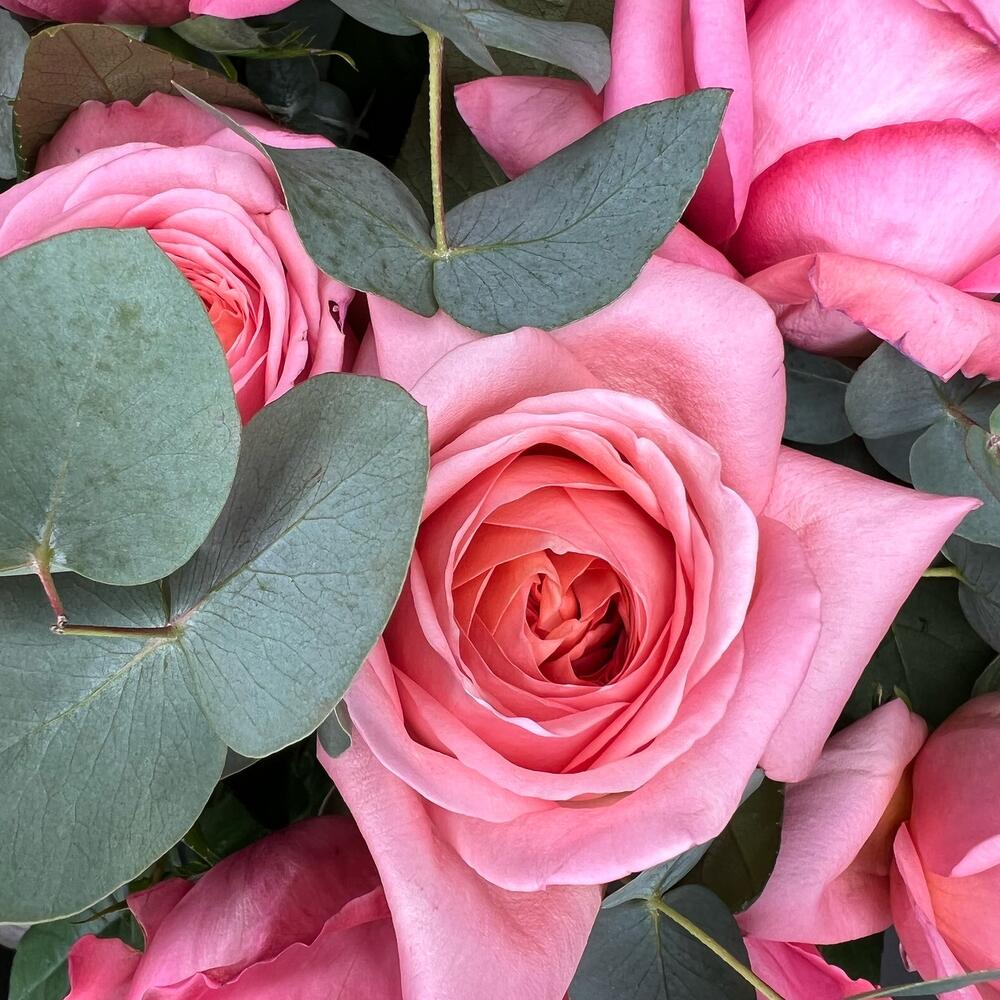 15 пионовидных роз с эвкалиптом