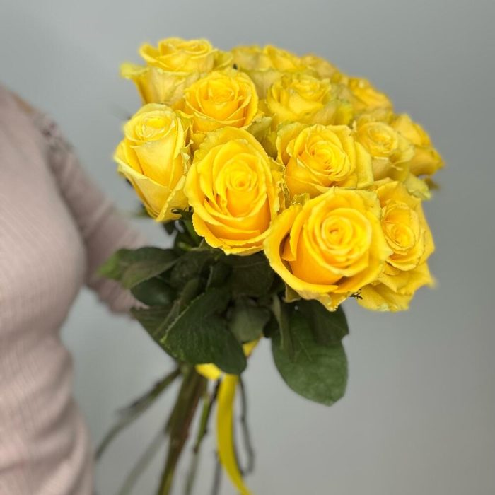 Лента атласная – 1 шт.Открыточка с вашими пожеланиями – 1 шт.роза желтая эквадор 60 см – 15 шт.