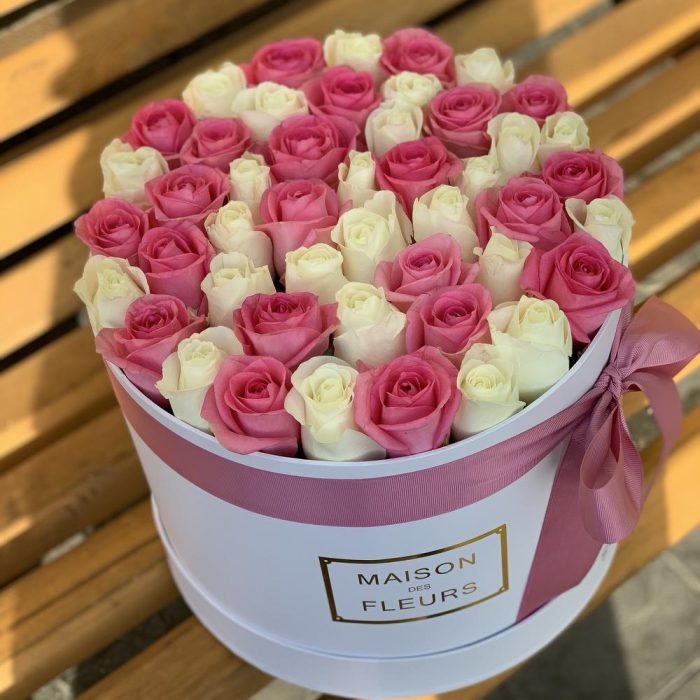 Роза розовая – 25 шт. Роза белая – 20 шт. Коробка круглая – 1 шт.